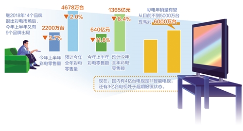 繼2018年14個品牌退出后,今年上半年彩電市場又有9個品牌出局。彩電市場雖量價齊跌,但未來并不悲觀。企業(yè)正擁抱全面物聯(lián)網(wǎng)化、國際化、更新消費(fèi)等機(jī)遇,準(zhǔn)備打一場漂亮的翻身仗——